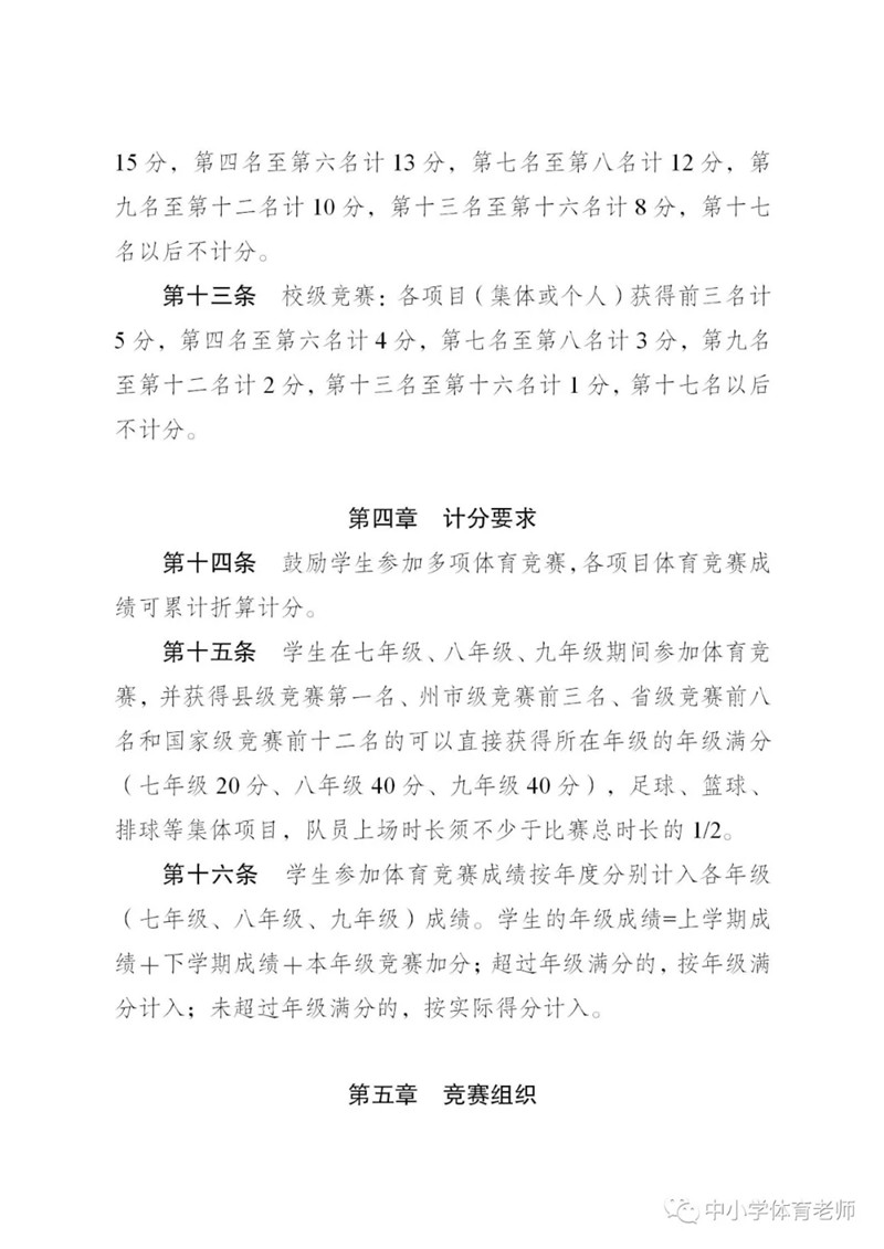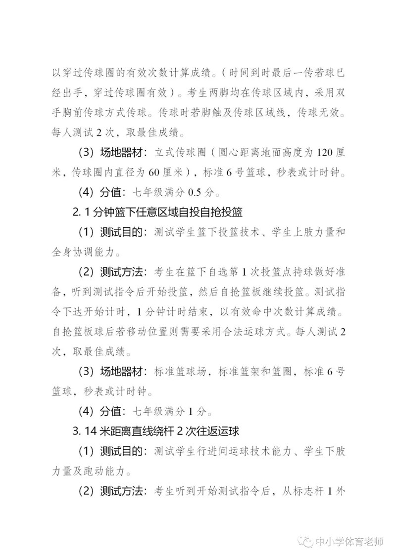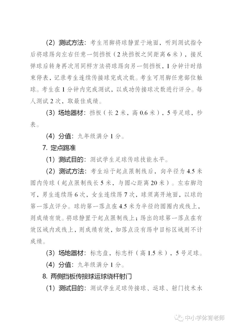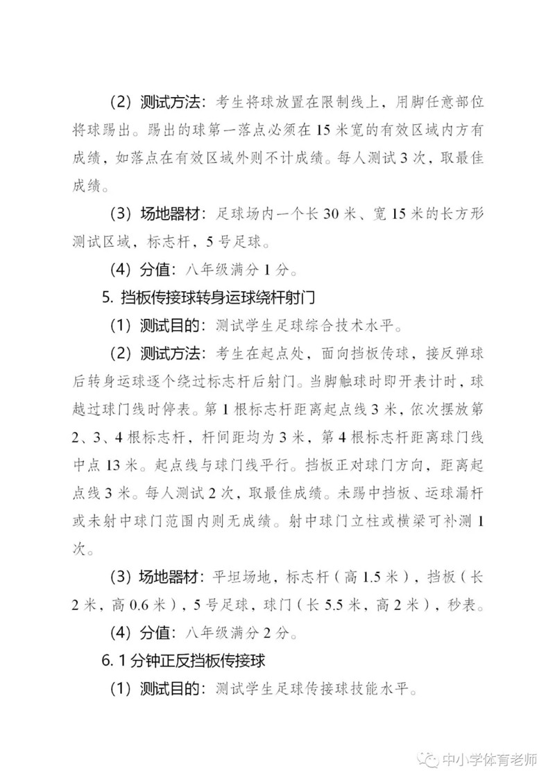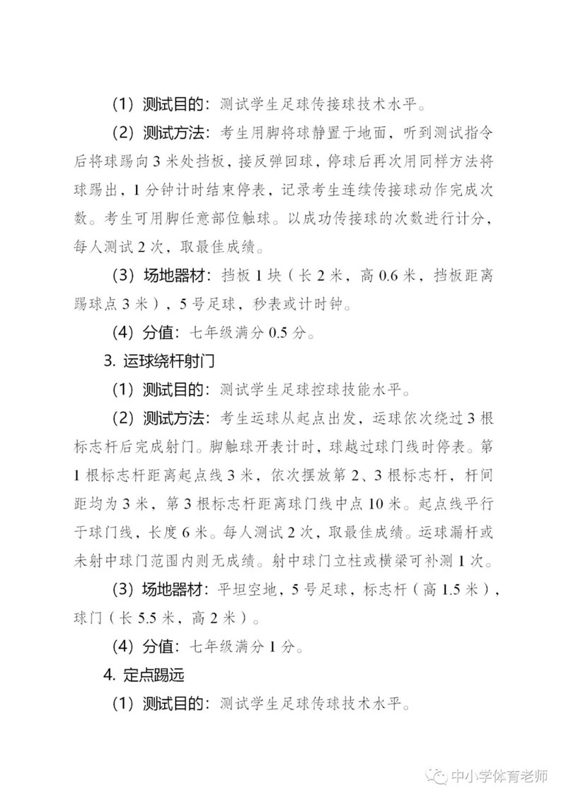 明確體育從50分提高到100分,其中七年級滿分20分,八年級滿分40分,九年級滿分40分??荚噧热莅ɑA體能測試、專項技能測試和體質健康監(jiān)測三部分,并且競賽有加分。足球入選男、女專項技能測試項目。附考試方案全文。